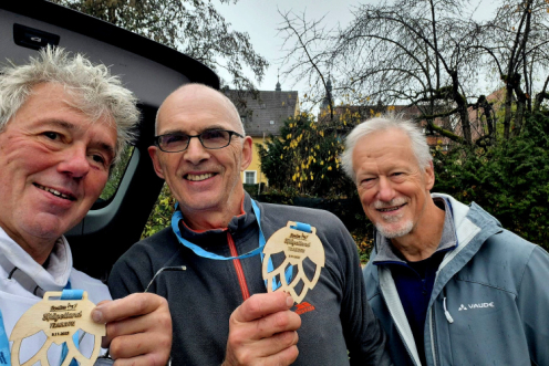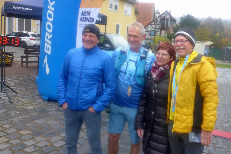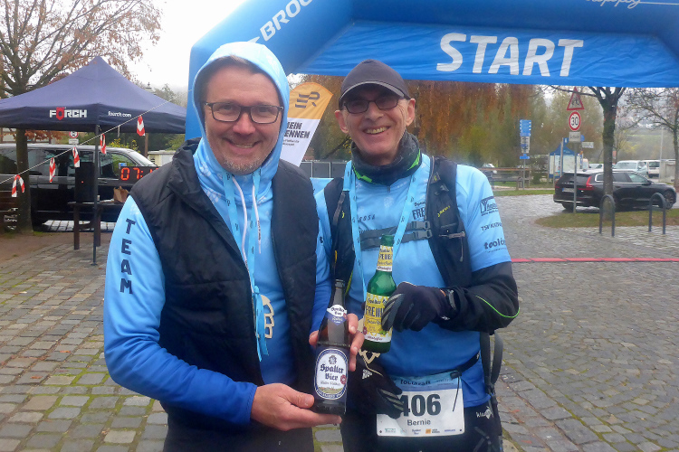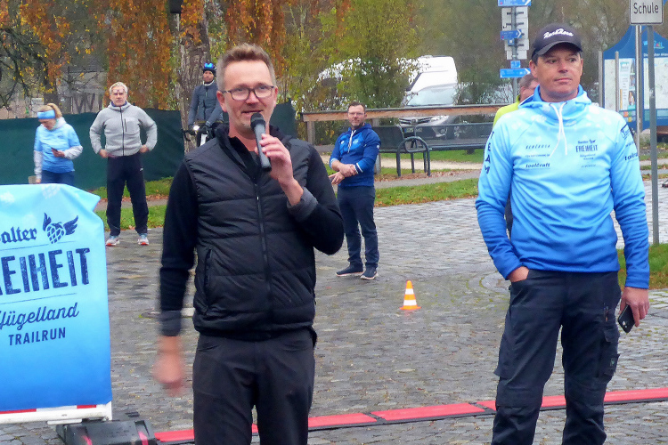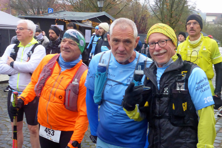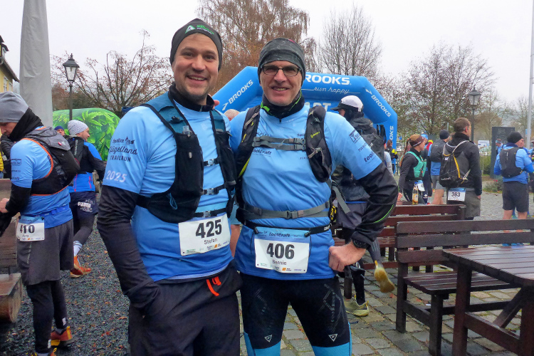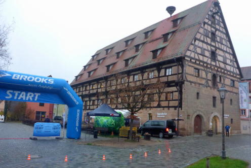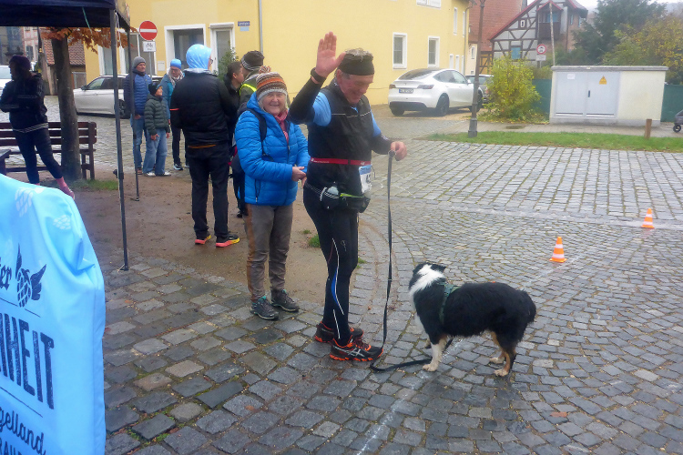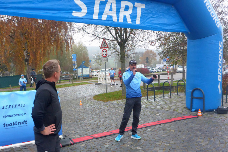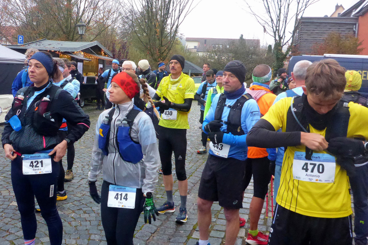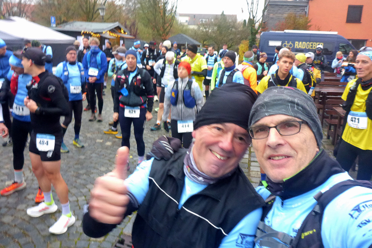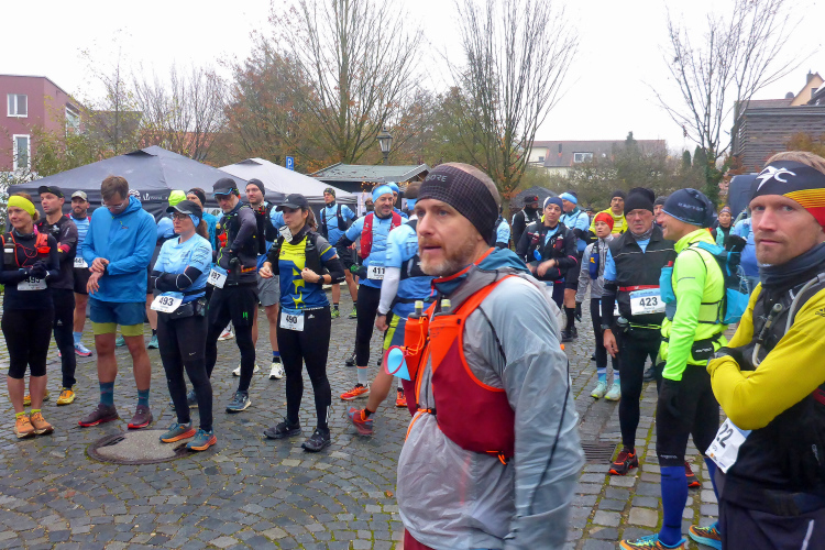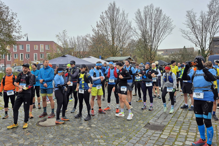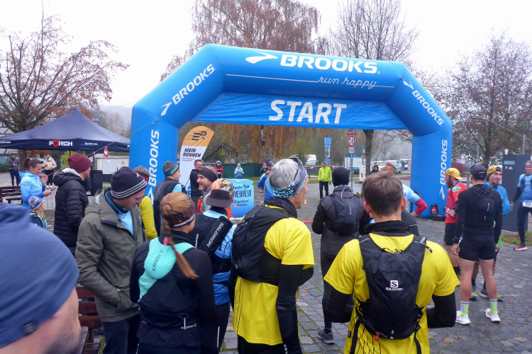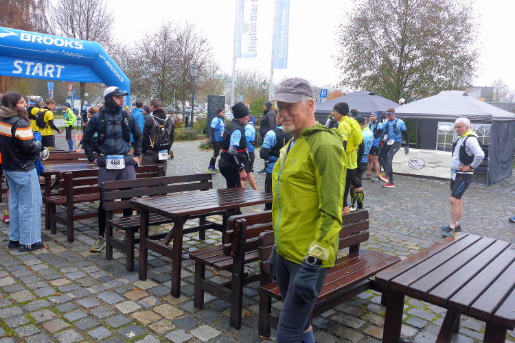 Wettermäßig hat sich leider in der Nacht auch einiges getan. Die Nebelglocke hat sich aufgelöst, dafür sind dichte Wolken aufgezogen, die auch immer wieder Regen mit sich bringen können. Aber immerhin ist die Temperatur etwas gestiegen. So 7 bis 8 Grad C sind zu erwarten. Viele am Start haben auch wirklich das Läufershirt an, es steht sinnbildlich für die Unterstützung, die man von den drei Partnern erhält. Aber dem Wetter geschuldet, zieht es auch ein Teil vor, mit Regenjacke zu laufen, obwohl es derzeit gerade nicht regnet. Übrig geblieben von 100 Angemeldeten, sind heute noch 8 Frauen und 74 Männer, da haben es wohl einige vorgezogen, bei dem nasskalten Wetter zu Hause zu bleiben.