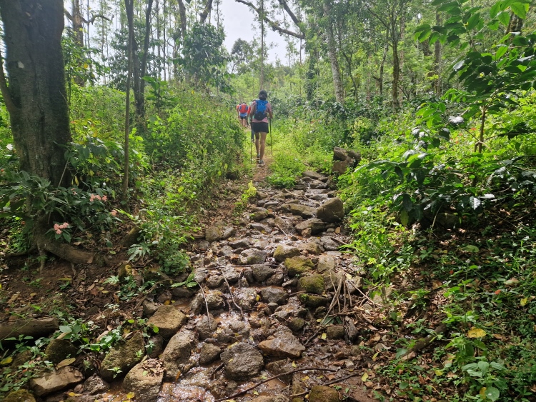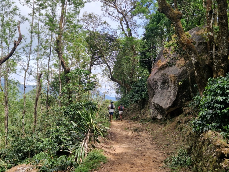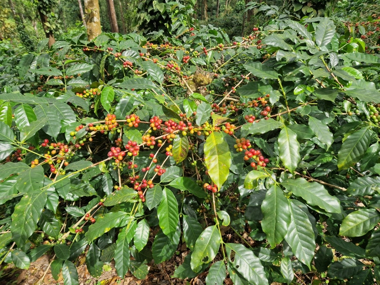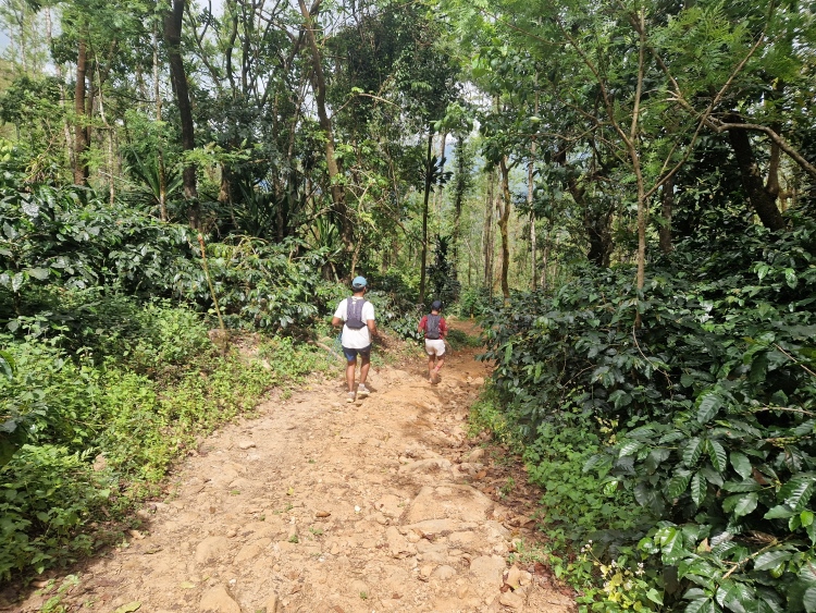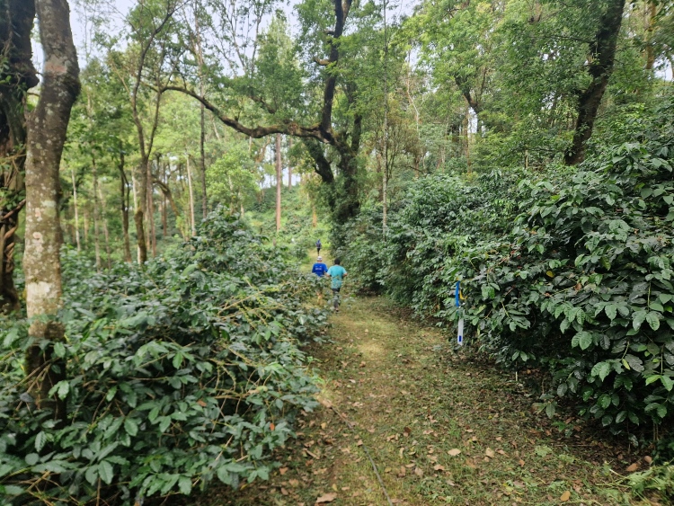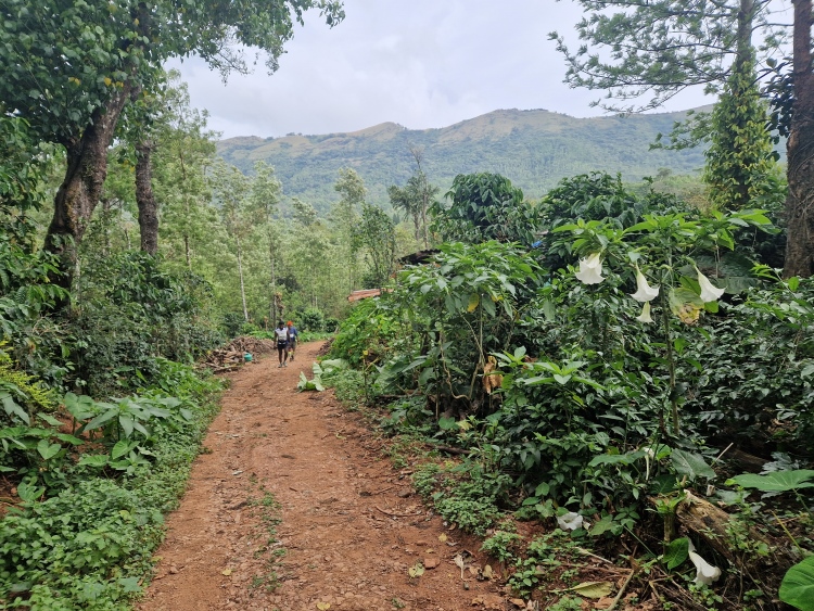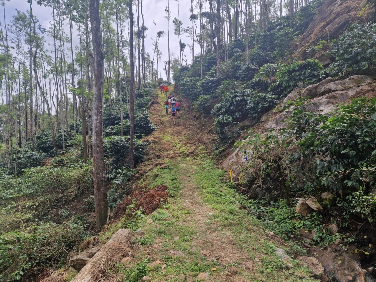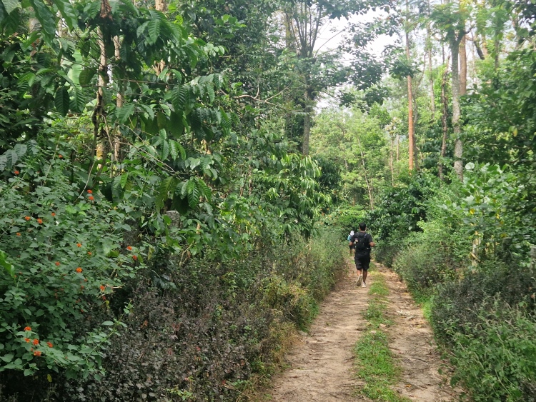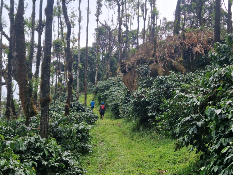 Die Strecke verläuft wie gesagt weitgehend durch Kaffeeanbaugebiete, serpentinenartig die Hänge hoch und runter. Dies ist allerdings eine recht wilde Angelegenheit, da nicht wie in Plantagen eine Grundsymmetrie befolgt wird, sondern eher „natürlich“ gepflanzt ist, man ist also eher in einem Kaffeewald. Dazwischen gibt es natürlich auch die typischen Bäume der Region inklusive Betelnuss-Palmen, Bananen und Silber-Eichen. Die Hänge sind in Privatbesitz, so genannte „Estates“, auf denen am Samstag natürlich auch gearbeitet wird. Vor allem mit Handsensen, so dass es in Summe dennoch recht ruhig war.