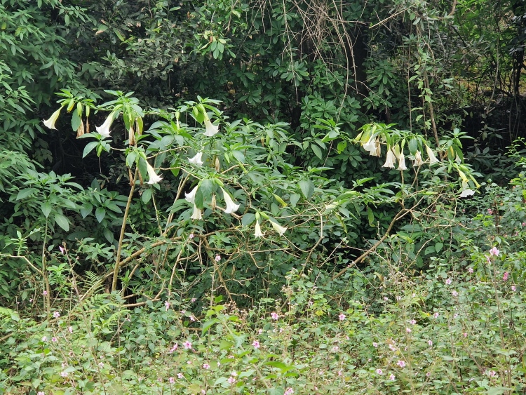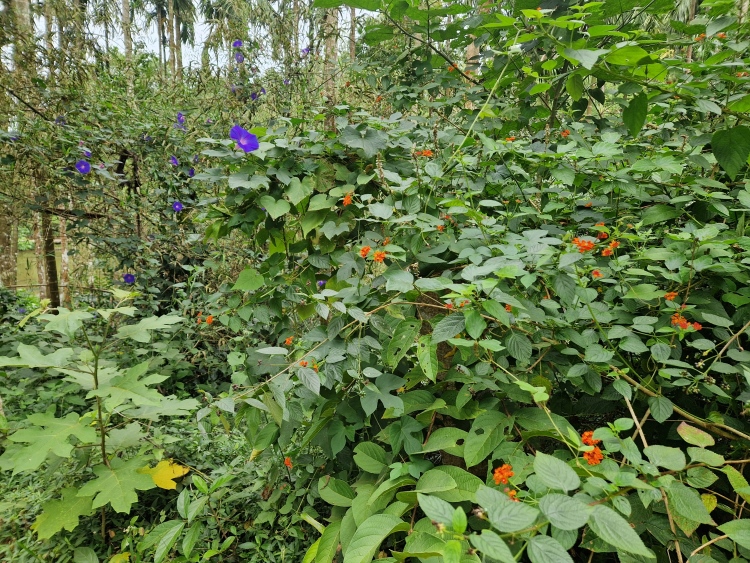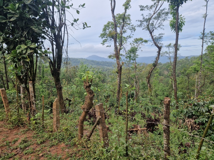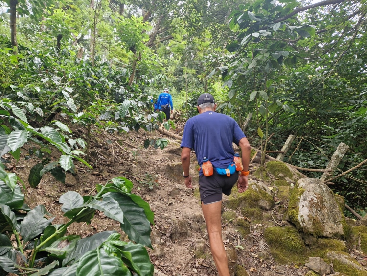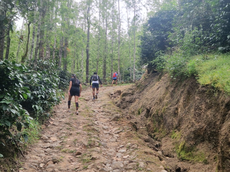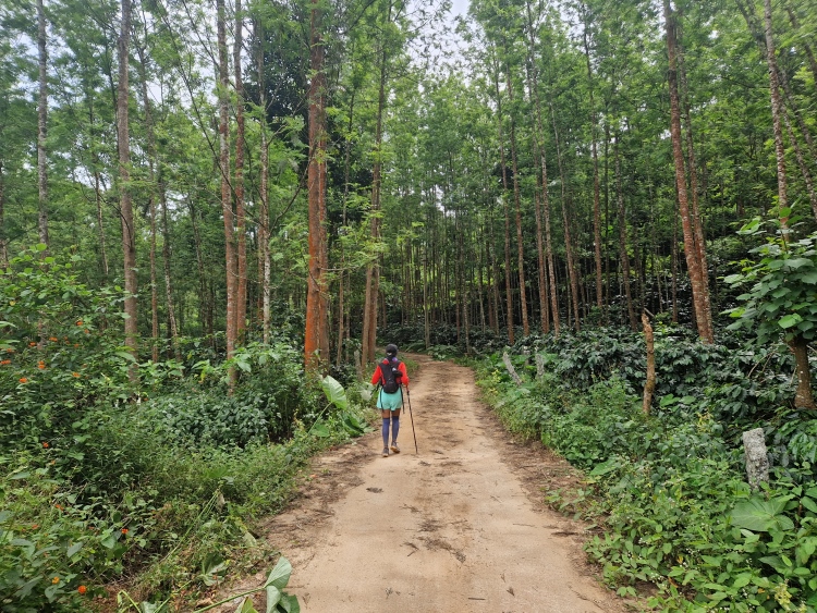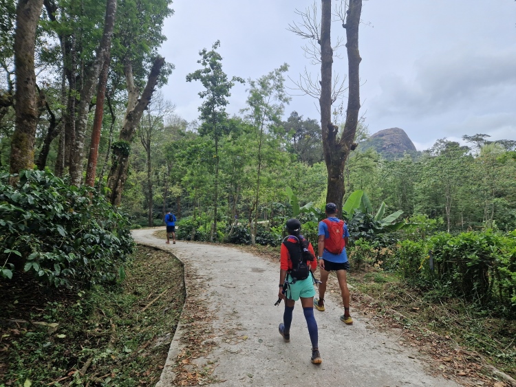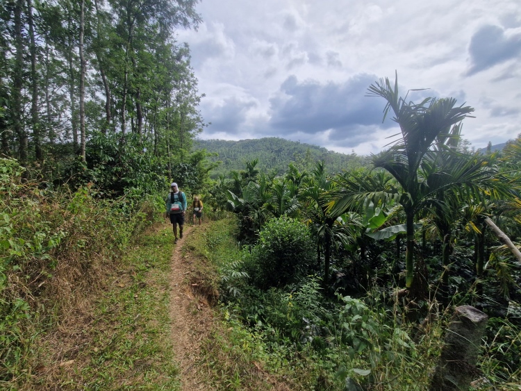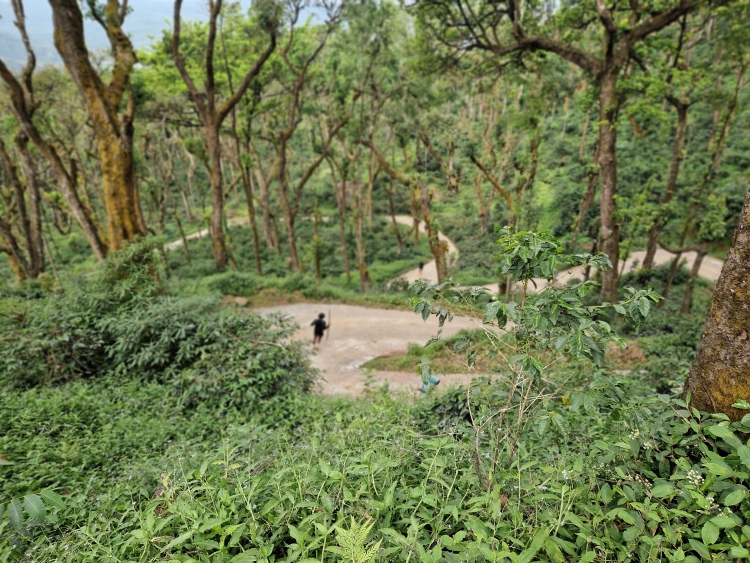 Die Strecke verläuft wie gesagt weitgehend durch Kaffeeanbaugebiete, serpentinenartig die Hänge hoch und runter. Dies ist allerdings eine recht wilde Angelegenheit, da nicht wie in Plantagen eine Grundsymmetrie befolgt wird, sondern eher „natürlich“ gepflanzt ist, man ist also eher in einem Kaffeewald. Dazwischen gibt es natürlich auch die typischen Bäume der Region inklusive Betelnuss-Palmen, Bananen und Silber-Eichen. Die Hänge sind in Privatbesitz, so genannte „Estates“, auf denen am Samstag natürlich auch gearbeitet wird. Vor allem mit Handsensen, so dass es in Summe dennoch recht ruhig war.