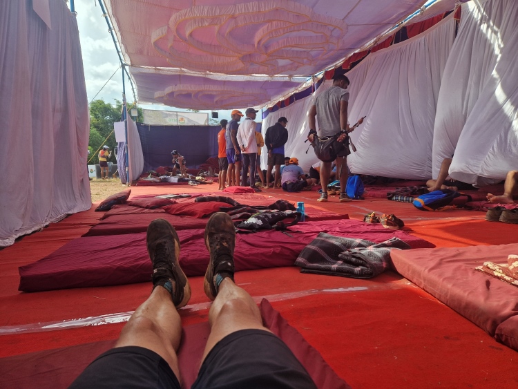 Am Ziel gibt es neben dem Essen und medizinischer Versorgung noch etwas ganz Tolles: Einen Ruheraum. Ein Zelt mit Matratzen und Kissen, einfach so zum Ausspannen. Nehmen gar nicht so viele Leute in Anspruch, ist aber wirklich große Klasse, vor allem wenn man wie ich viel Zeit hat.
