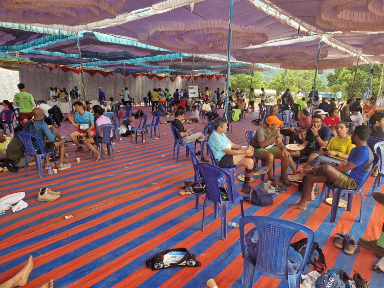 „It is not a race, but a run to promote trailrunning”. Das klingt gut. Getragen wird der Lauf ausschließlich von freiwilligen Helfern, darunter acht Fotografen und mindestens vier Drohnen. In Indien sind persönliche Erinnerungen mindestens genauso wichtig wie bei uns, zumal die Bevölkerung jung ist und wächst, so dass viele ganz am Anfang ihrer „Laufbahn“ stehen. Stöcke sind nicht nötig, einige wenige haben dennoch welche dabei, einige auch nur einen Stock, was ich bisher noch nirgends gesehen habe, was aber die Stabilität wohl durchaus unterstützt. Ansonsten sind die Leute alle sehr professionell ausgestattet, wie bei uns auch. Es gibt ein paar Sandalenläufer, aber die tragen keine Flipflops, die man auf der Straße zu häufig sieht, sondern durchaus ernsthafte Laufsandalen, aus den gleichen Gründen wie bei uns, nicht, weil wir hier in Indien sind.